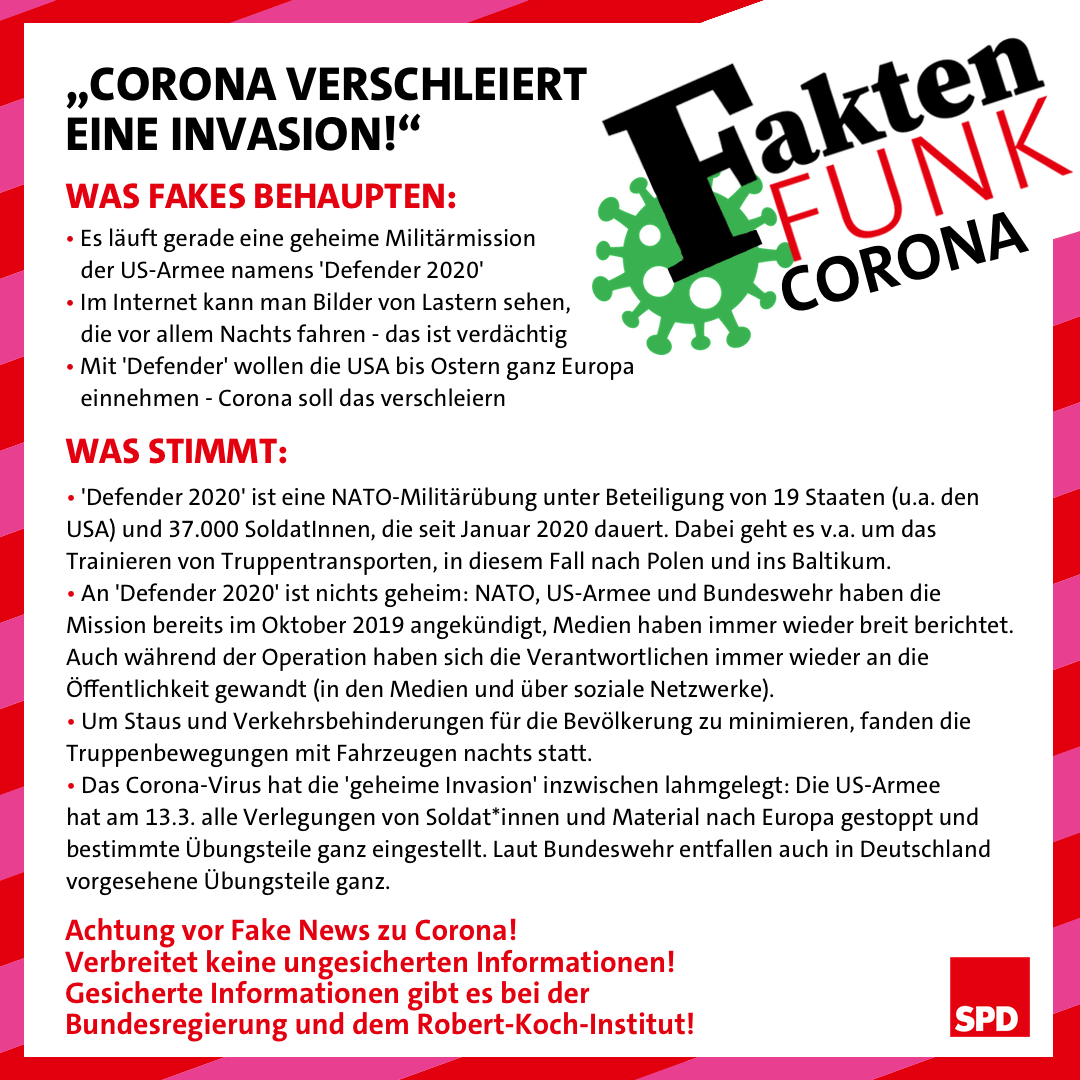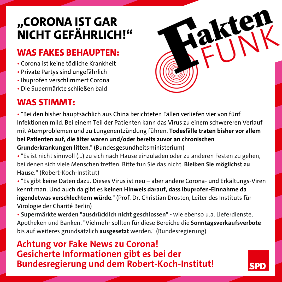 Bleibt zuhause. Schränkt eure sozialen Kontakte im Analogen ein. Haltet Abstand zu euren Mitmenschen. Und verbreitet keine Fake News. Verbreitet gesicherte Informationen, denn viele Menschen sind unsicher und haben Fragen zu ihrer Gesundheit, ihrer Arbeit oder der Kinderbetreuung. Hierzu bietet unsere Themenseite eine große Bandbreite an hilfreichen Informationen. Und wenn ihr Fake News bekommt oder euch unsicher seid: Schickt sie uns einfach auf Telegram. Wir schauen sie uns an.