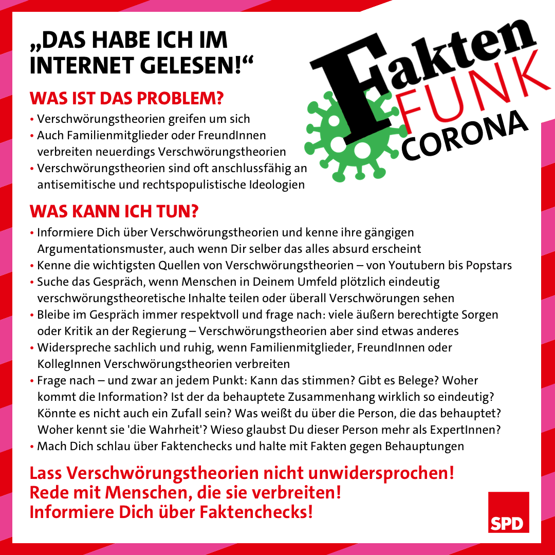 Deshalb: Wenn ihr in eurem sozialen Umfeld Menschen kennt, die in der Corona-Krise plötzlich anfangen, solche Theorien zu verbreiten – und sei es auch noch so gut gemeint, weil die Personen meinen, wichtige Informationen weitergeben zu müssen: sprecht mit ihnen. Fragt nach, wie sie auf die Idee einer Verschwörung kommen. Fragt sie, woher sie diese Informationen haben. Und überprüft mit ihnen, ob das alles so stimmen kann – gerade das Nachhaken nach den Belegen kann oft die Widersprüche von Verschwörungstheorien schnell sichtbar machen. Ob im persönlichen Gespräch, in den sozialen Netzwerken oder auf Whatsapp und Telegram. Die Forschung zeigt: Menschen messen der Urteilskraft ihres engen sozialen Umfelds immer noch die größte Bedeutung bei. Deshalb sind Gespräche mit Familienangehörigen, FreundInnen und KollegInnen jetzt besonders wichtig. Auf Augenhöhe, ruhig, sachlich.